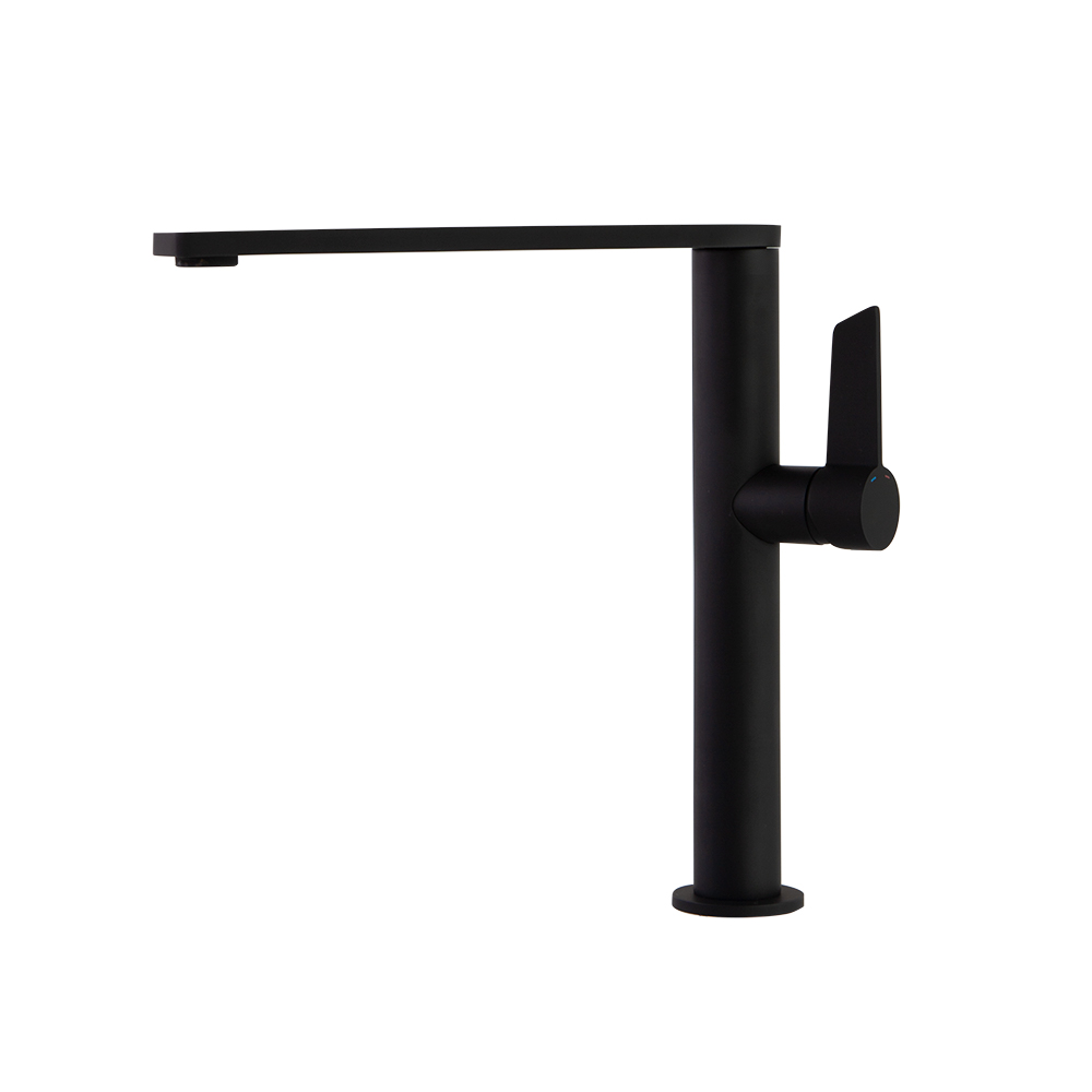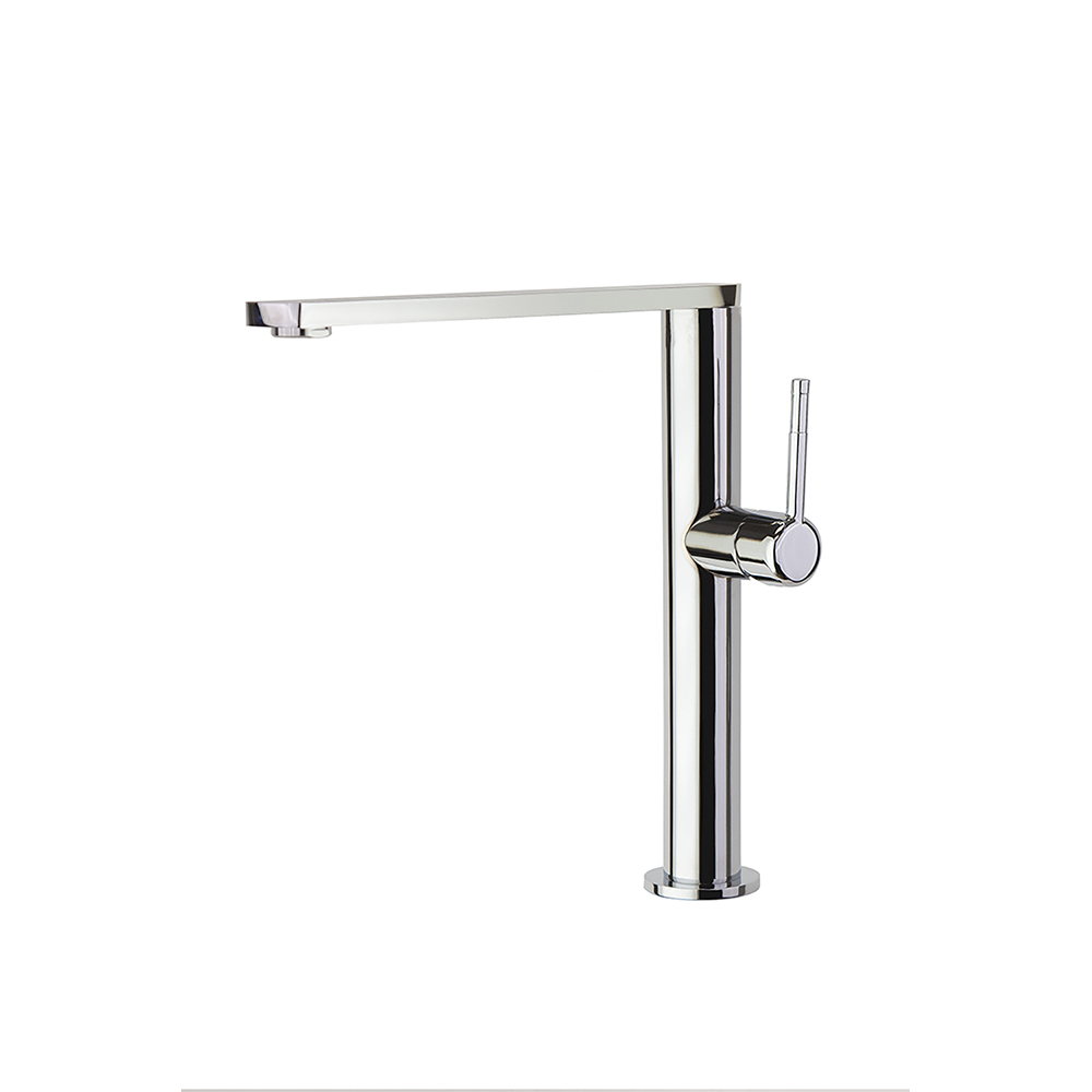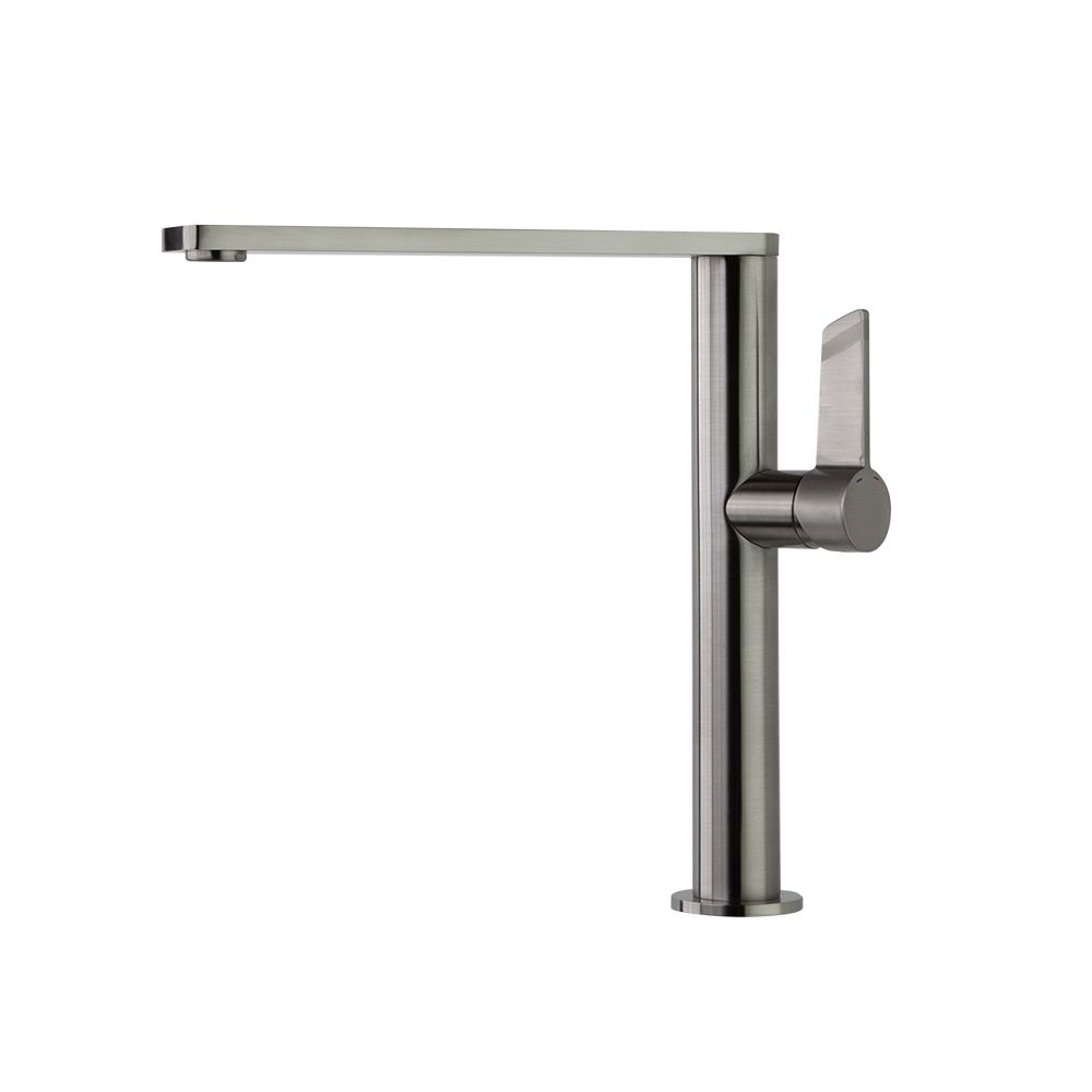 Torneira monocomando de cozinha com bica alta giratória 360º, de linhas retas, com sistema anticorrosão patenteado, níquel escovado de alta resistência devido ao seu tratamento PVD.