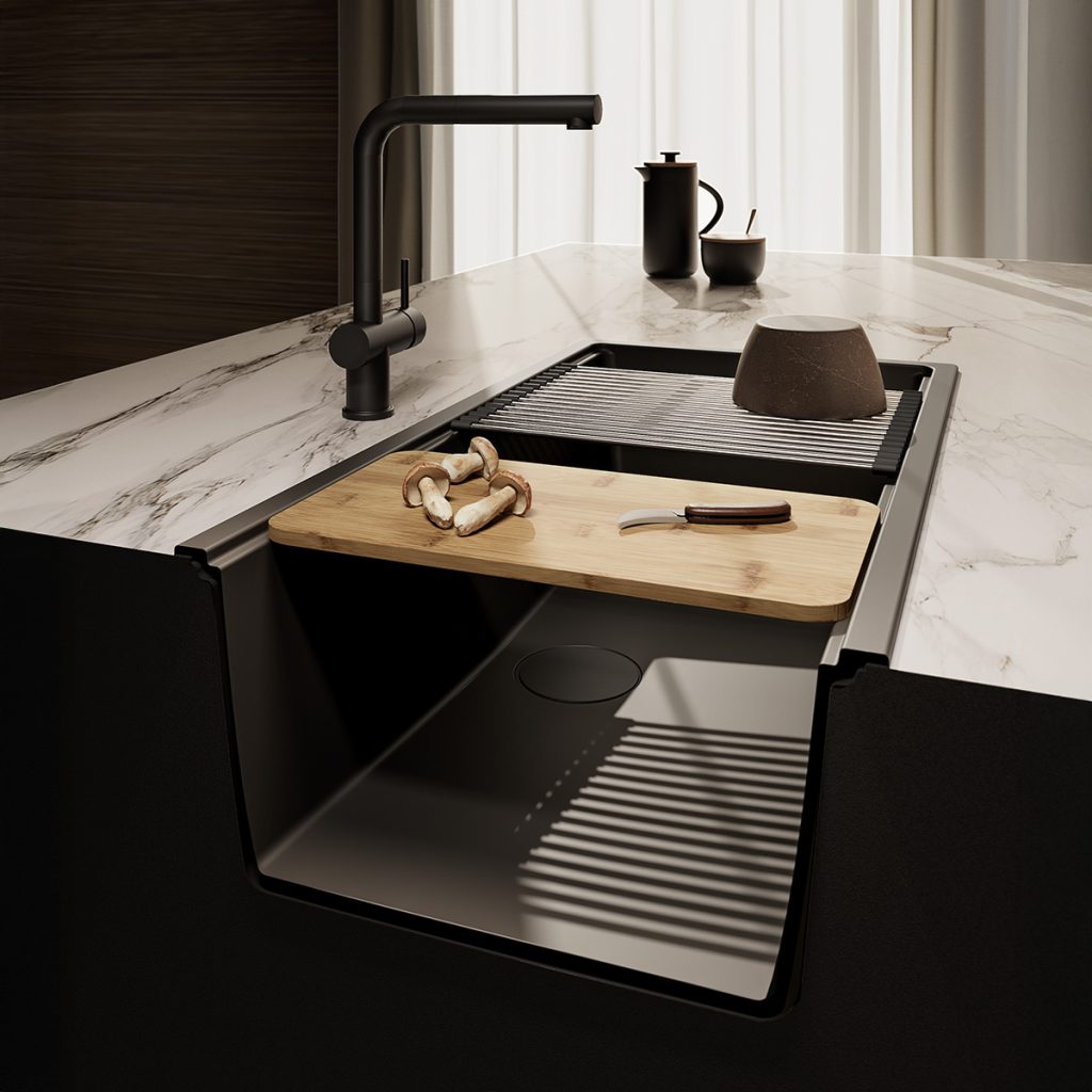 A profundidade generosa das cubas e o degrau integrado permitem o uso de acessórios, criando uma zona de preparação prática e funcional para o dia a dia.
