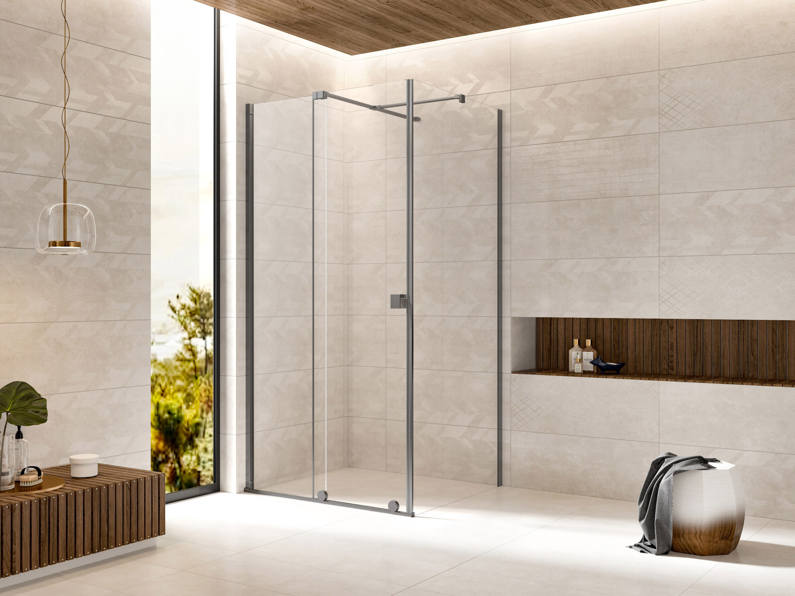 Disponível em frontal (1 Painel fixo + 1 porta correr ou 2 Free) ou em frontal com lateral fixo