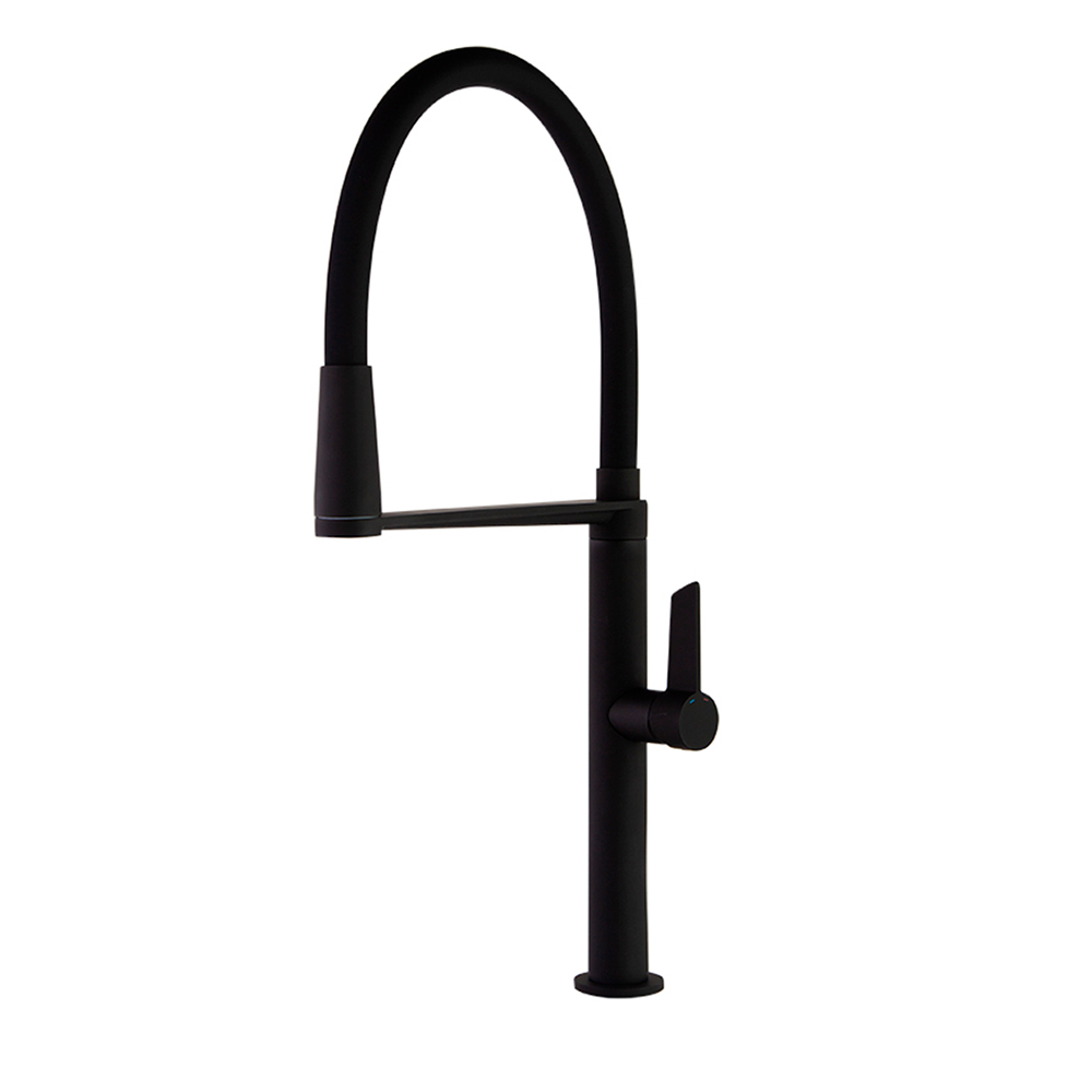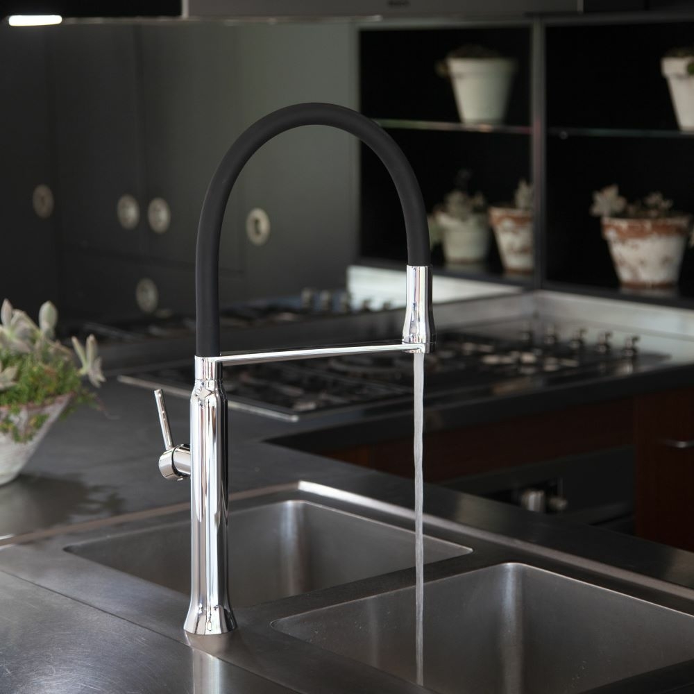 Torneira monocomando de cozinha de design minimalista, com bica giratória 360º, extraível e flexível de silicone preto, incorpora um inovador sistema de ímanes, que lhe permite voltar à sua posição inicial.