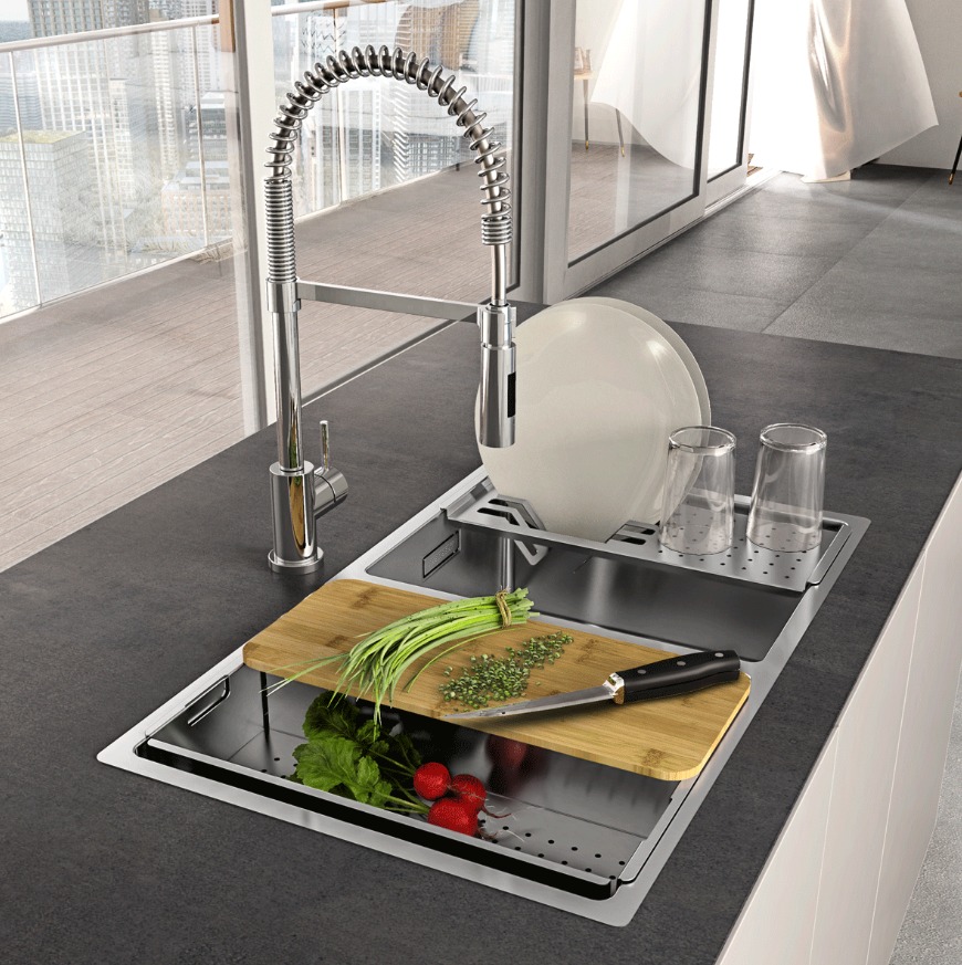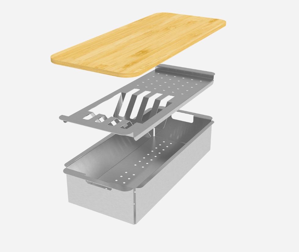 Conjunto de 3 acessórios (tábua de corte, escorredor de pratos e colander) que facilitam as tarefas diárias na cozinha.