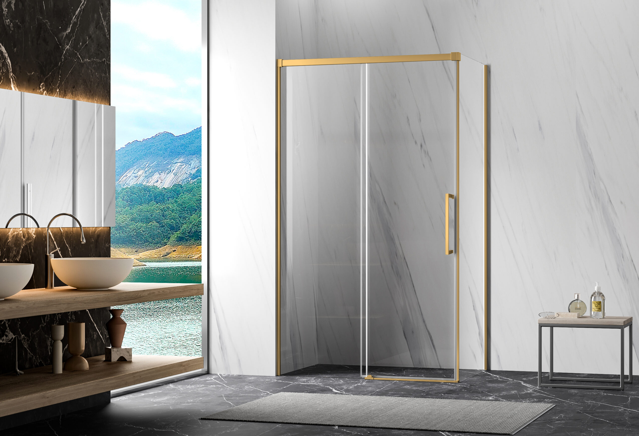 Disponível em frontal (1 Painel fixo + 1 porta correr ou 2 fixos + 2 portas correr), ou em frontal com lateral fixo