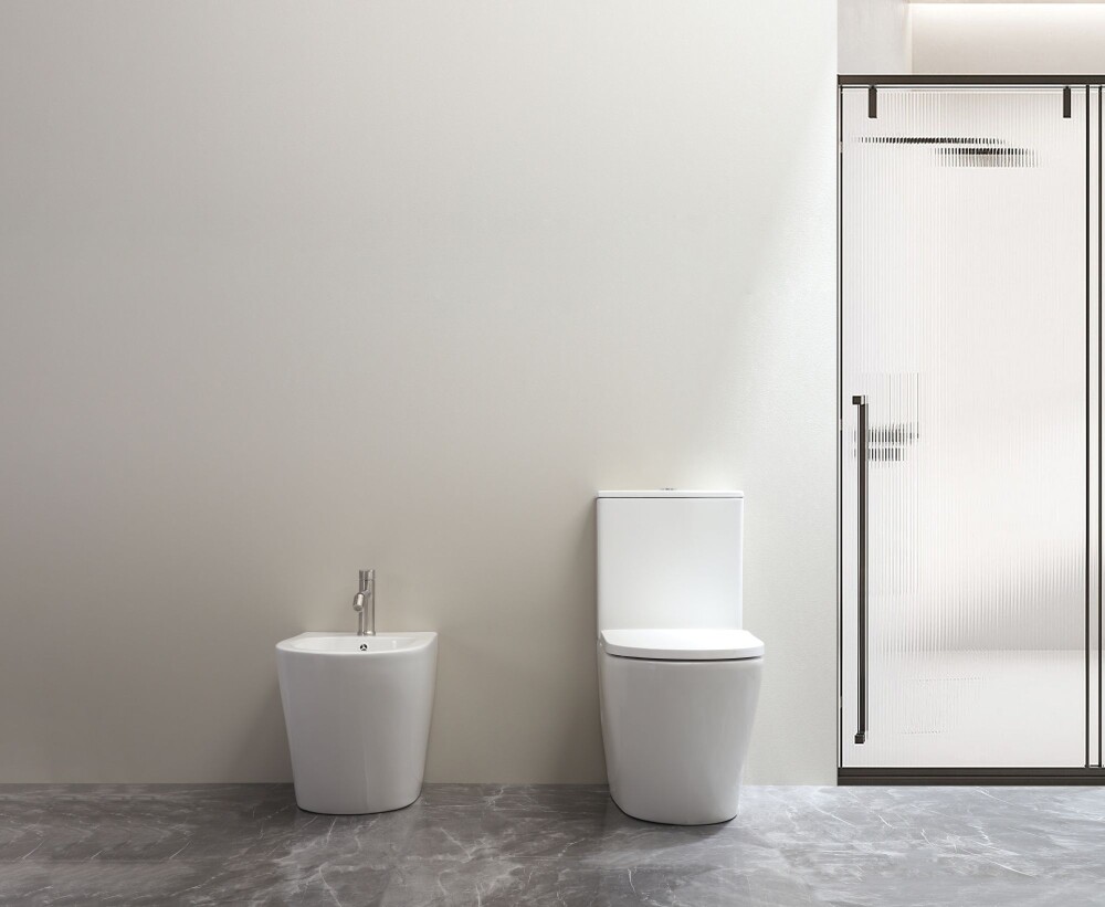 Descarga horizontal. Rimless (sem aro), mais higiénica e fácil de limpar.