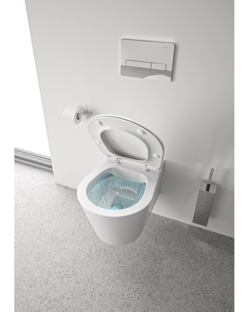 Descarga horizontal. Rimless (sem aro), mais higiénica e fácil de limpar.