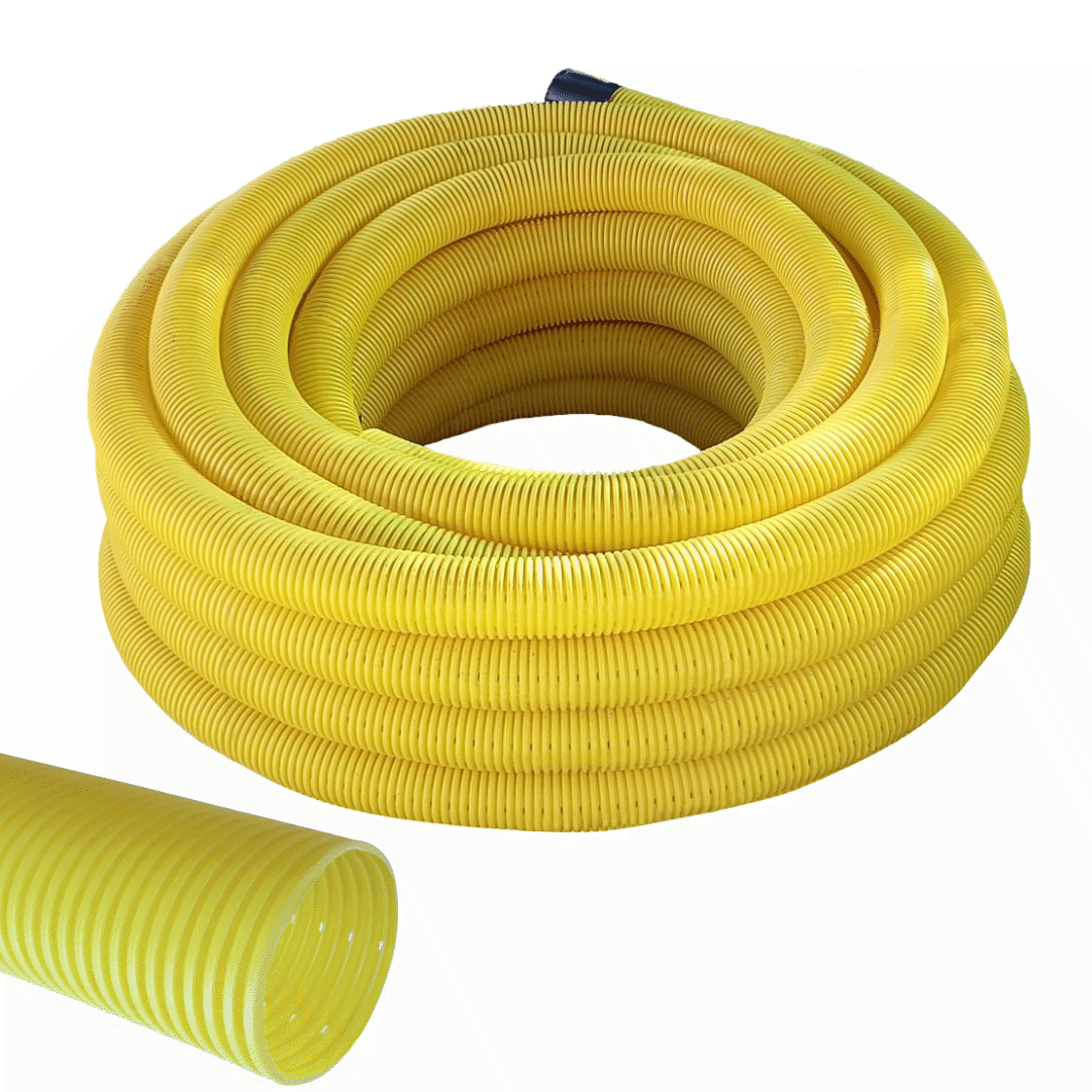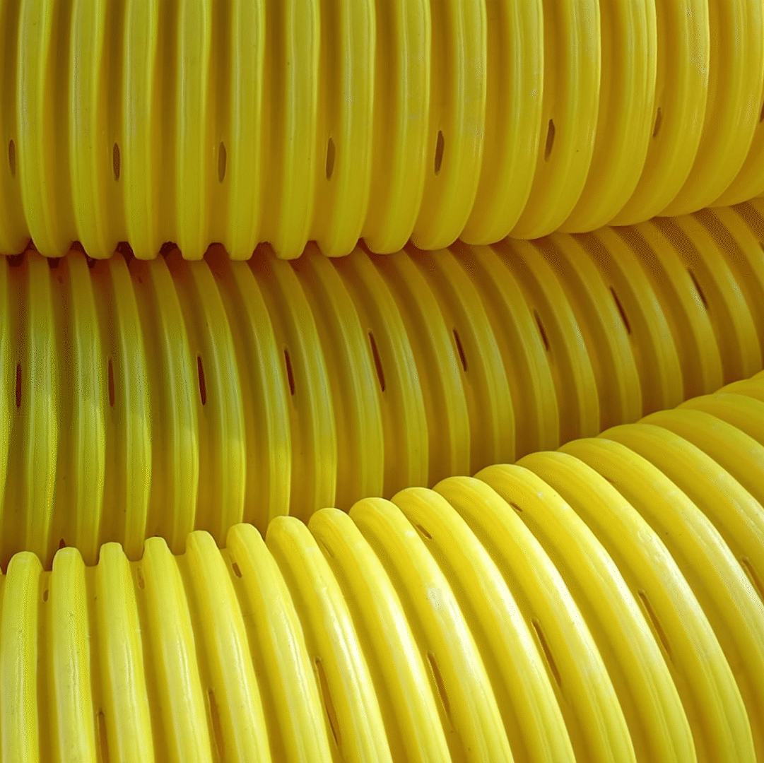 Tubo circular de parede simples corrugada interior e exteriormente. Superfície exterior é de cor amarela e a interior de cor natural do polietileno.