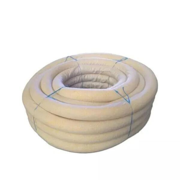 Tubo circular de parede simples corrugada interior e exteriormente. Superfície exterior é de cor amarela e a interior de cor natural do polietileno.